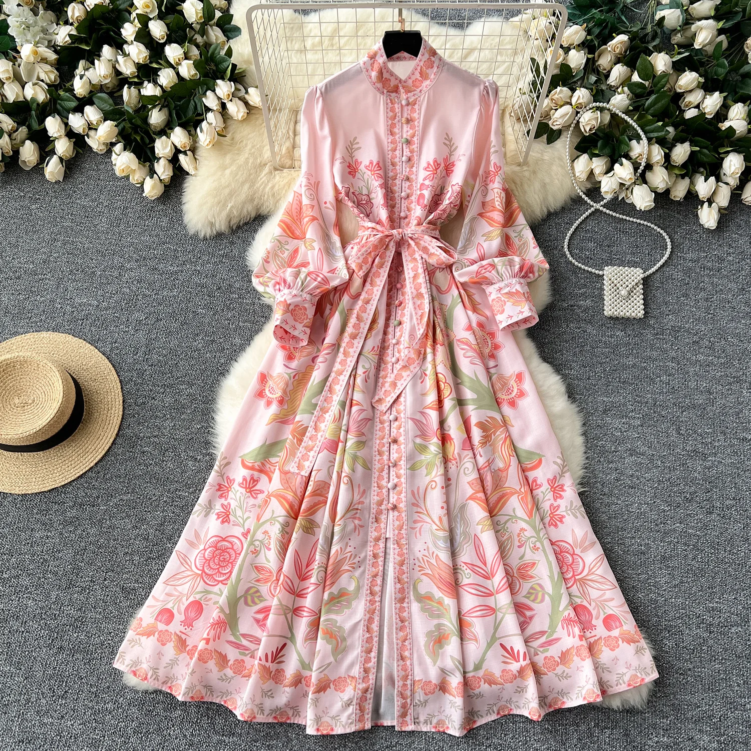 Customized Retro Long Sleeved Printed Dress Women Waistband Long Dress